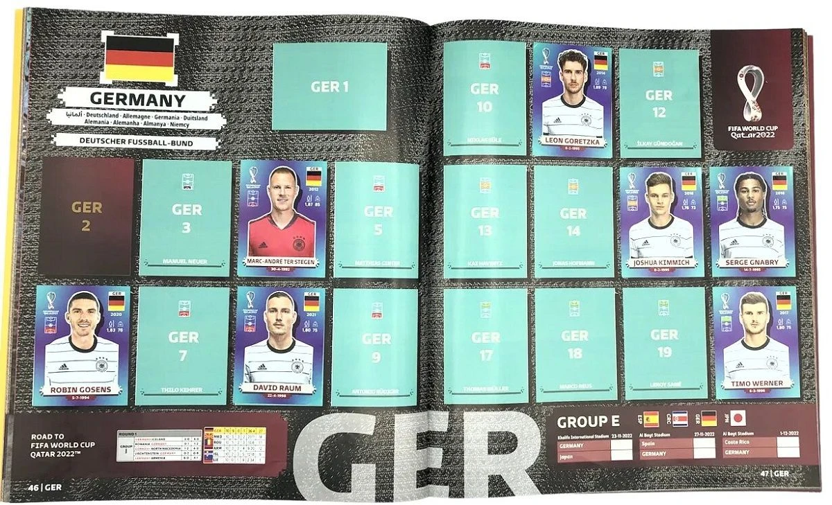 Sammelabum von Panini zum FIFA World Cup Qatar 2022. Fakten: 32 Nationalmannschaften 80-seitiges Stickeralbum 670 Sticker zum Sammeln (davon 50 Special-Sticker) Zusätzlich 80 Panini Extra-Sticker! 20 verschiedene Sticker in 4 Farb-Varianten, von denen je ein Sticker durchschnittlich jeder 100. Tüte beigemischt wird.