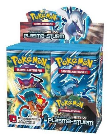 Deutsches Booster-Display mit Sammelkarten der achten Pokemon Schwarz & Weiss Serie: Plasma-Sturm. Die neue Serie Plasma-Sturm enthält über 130 neue Karten.