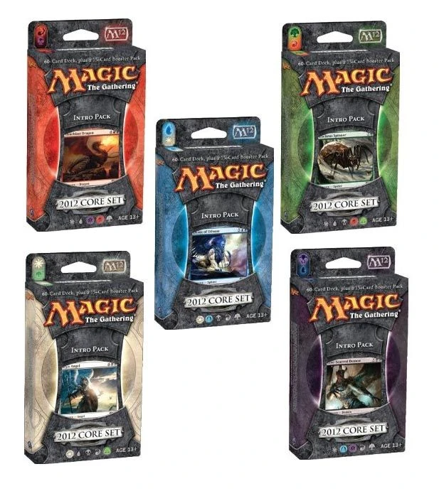 5er Set mit allen erhältlichen Intro-Packs der Magic-Serie 2012 Core Set in Englisch: Blood and Fire, Entangling Webs, Grab for Power, Mystical Might und Sacred Assault.