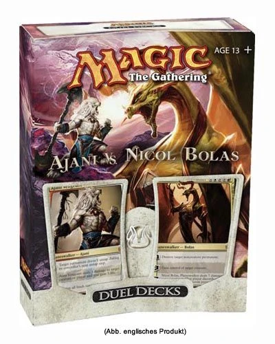 Das Duel Deck Ajani gegen Nicol Bolas in Deutsch enthält 2 spielfertige 60-Karten-Decks, 5 Rare + 1 Mythic-Rare Sammelkarten in jedem Deck. Dazu 2 Deckboxen + 3 Token Cards, 1 Strategiehilfe und 1 Spieleinsteigerhilfe. Alle Karten im Deck sind schwarzrandig und turnierlegal.